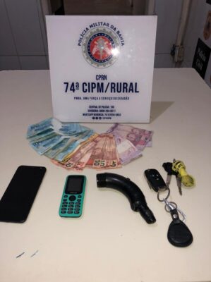 A 74CIPM/RURAL informou ainda que no momento da captura foram encontrados com os acusados: dois celulares, a quantia de R$ 1.280 ( um mil duzentos e oitenta reais), em espécie, 01 (um) cano PVC usado como arma, 01 uma motocicleta marca Honda, modelo FAN 150, um celular marca LG ou celular marca Positivo, além de duas chaves.