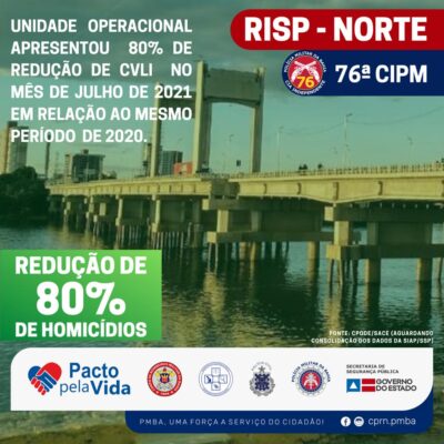 A 76ª Companhia Independente de Polícia Militar (CIPM), comandada pela Major PM Ivana, Unidade Operacional localizada em Juazeiro – BA, subordinada ao Comando de Policiamento da Região Norte (CPRN), comandado pelo Coronel PM Valter Araújo, apresentou no mês de julho uma redução de oitenta por cento (80%) no número de homicídio, em comparação ao mesmo período de 2020.