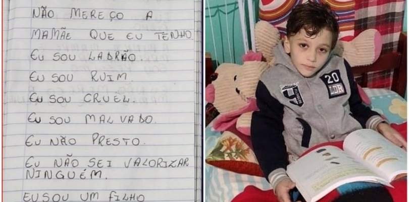“Eu sou um idiota”, “não mereço a mamãe que eu tenho”, “eu sou ladrão, “eu sou ruim” e “eu sou um filho horrível”, diziam as inscrições