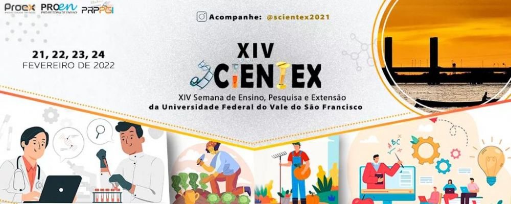 A 14ª Semana de Ensino, Pesquisa e Extensão (Scientex) da Universidade Federal do Vale do São Francisco (Univasf) será realizada de 21 a 24 de fevereiro no formato remoto. Principal evento acadêmico da Univasf, a Scientex apresenta os resultados das ações realizadas por estudantes, professores e técnico-administrativos em educação da Universidade, nas diversas mostras e jornadas que a compõem. Com o tema “(Re)Existência das Universidades em Tempos de Pandemia”, o evento é aberto à participação de toda a comunidade acadêmica e externa. A submissão de trabalhos pode ser feita até 28 de janeiro e as inscrições para ouvintes estão abertas até o primeiro dia do evento pelo site da Scientex.