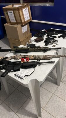 No veículo foram encontrados duas espingardas calibre 12 com 26 munições; um fuzil calibre 223/.556 com 117 munições; duas pistolas calibre 9mm com 64 munições; uma pistola calibre.40 com 10 munições; uma pistola calibre 380 com 28 munições; um revólver calibre 38 com cinco munições; e duas armas brancas, segundo a PRF.