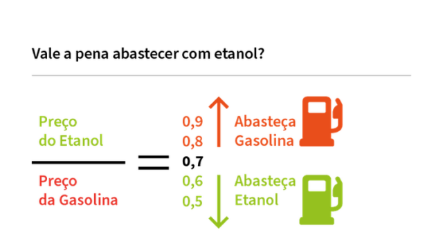 Para calcular, basta dividir o preço do álcool pelo valor da gasolina. Caso o resultado seja inferior a 0,7, o etanol será uma alternativa economicamente viável. Por exemplo: caso a gasolina esteja avaliada em R$ 7,40 e o etanol em R$ 5,20, o resultado é de 0,702. Neste cenário (5.2 dividido por 7.4), o etanol é vantajoso.