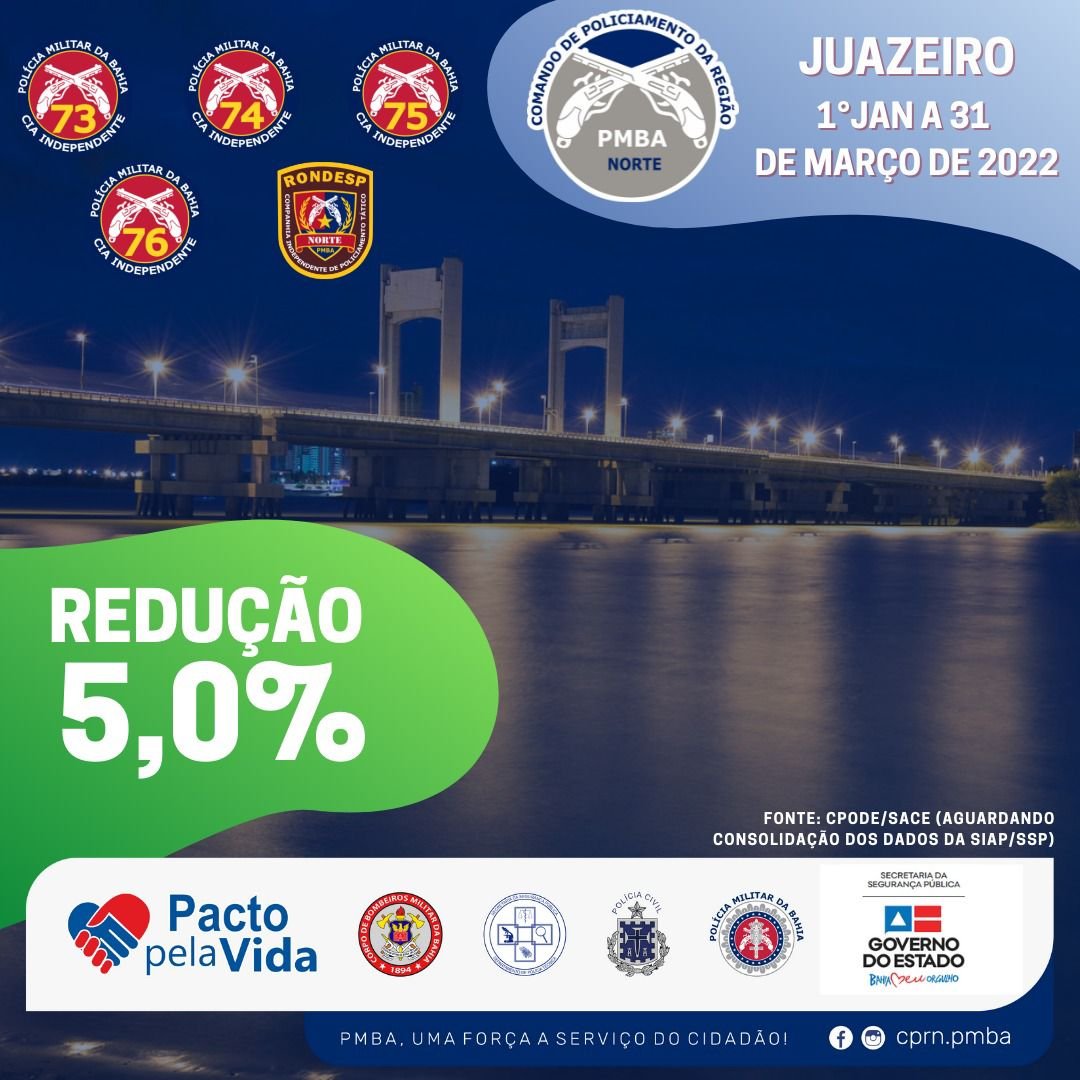 O Comando de Policiamento da Região Norte (CPR-N), com 53 munícipios na área de sua responsabilidade, comandado pelo Coronel PM Valter Araújo, em cumprimento às diretrizes estratégicas do Excelentíssimo Senhor Coronel PM Coutinho, Comandante-Geral, após análise dos Índices dos Crimes Violentos Letais Intencionais (CVLI), no primeiro trimestre de 2022, em comparativo ao mesmo período de 2021, observou a redução de 5%, na cidade de Juazeiro – BA, município que sedia quatro (04) Companhias Independentes de Polícia Militar (CIPM), sendo elas: 73ª, 74ª, 75ª e 76ª; bem como uma (01) Companhia Independente de Policiamento Tático (CIPT-N).