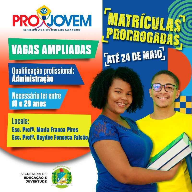 A Prefeitura de Juazeiro, através da Secretaria de Educação e Juventude (Seduc), prorrogou as matrículas para o Programa Nacional de Inclusão de Jovens (Projovem), no município. O programa é voltado para jovens com idades entre 18 e 29 anos que não concluíram o ensino fundamental, e visa promover a escolarização e qualificação profissional por meio da oferta de um curso técnico de Administração. As matrículas são gratuitas e podem ser realizadas presencialmente, até o dia 24 de maio.