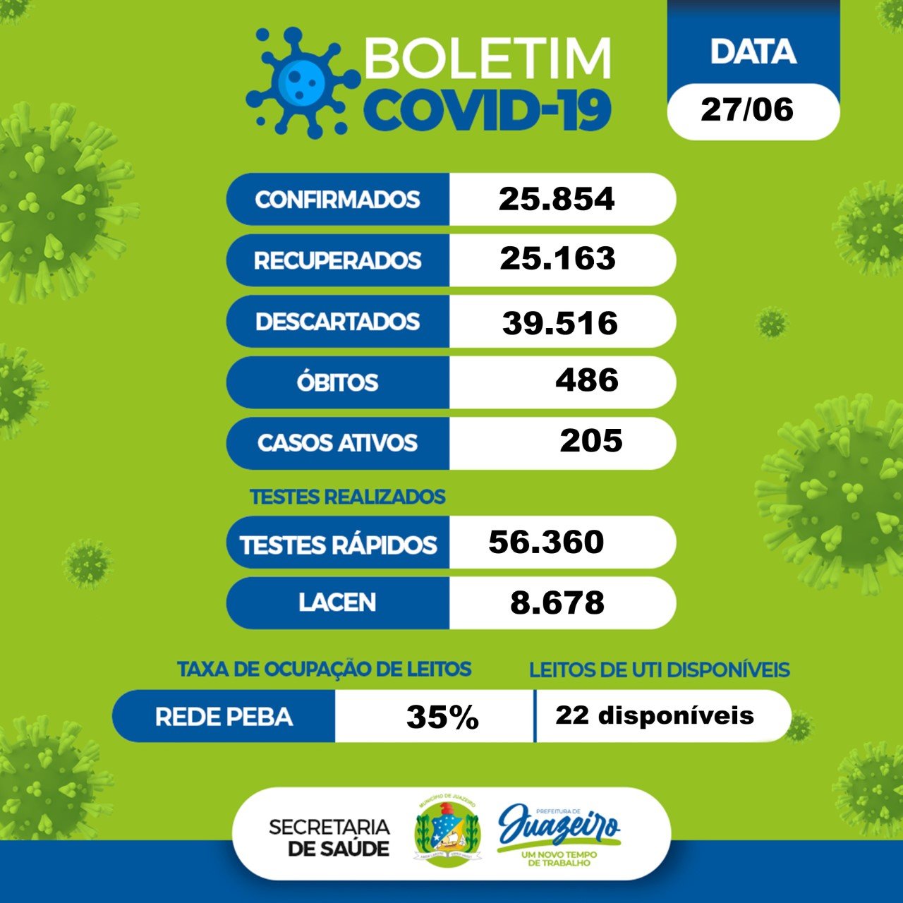 De acordo com o levantamento, 25.854 moradores foram infectados desde o início da pandemia na cidade, dos quais 25.163 já estão recuperados. Os casos descartados somam 39.516. Juazeiro tem 205 casos ativos do novo coronavírus.
