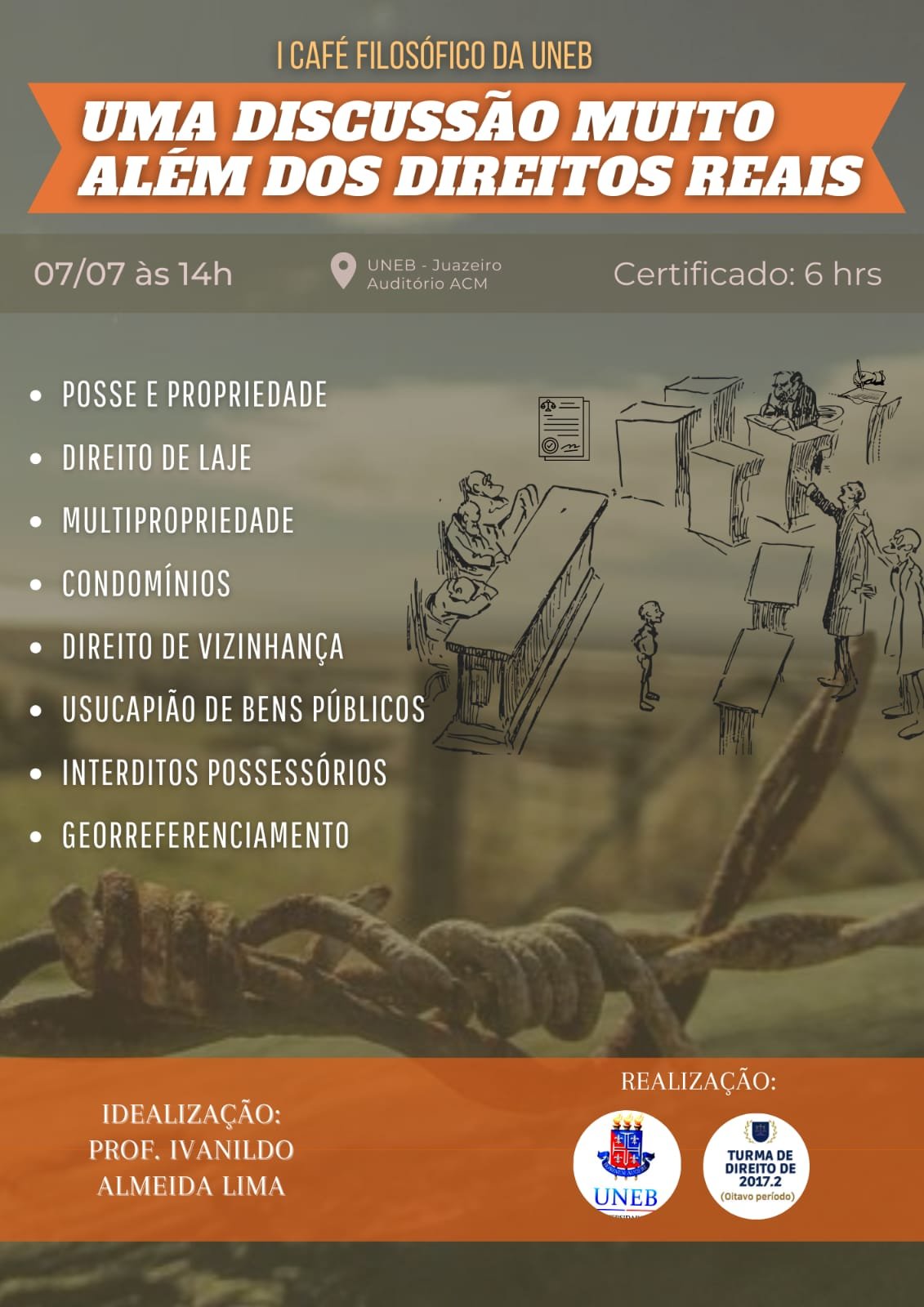 O Departamento de Tecnologia e Ciências Sociais (DTCS) da Universidade do Estado da Bahia (UNEB), Campus III, em Juazeiro, promove na próxima quinta-feira (7), Roda de conversa Café Filosófico: “discussão muito além dos Direitos Reais”, que será realizada no auditório Antônio Carlos Magalhães, a partir das 14h.