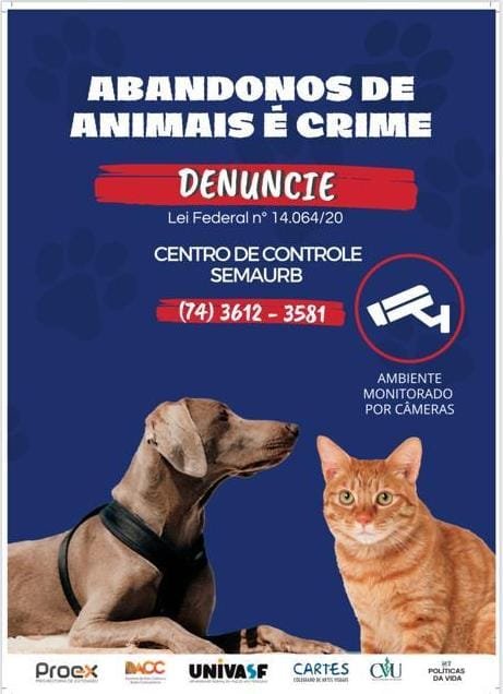 Idealizada pelos docentes do Colegiado de Medicina Veterinária (CMVet) da Universidade Federal do Vale do São Francisco (Univasf) Alexandre Redson e Ana Amélia Domingues, que integram o Núcleo Temático (NT) Políticas da Vida, a campanha acontecerá em seis etapas. Nesta fase inicial, serão fixados cartazes nas entradas e saídas dos campi da Universidade, com o slogan “Abandonos de animais é crime”, incentivando a denúncia da prática. Os cartazes para a campanha foram produzidos pela equipe do projeto de extensão “Estudos aplicados a serviços de Artes Visuais”, realizado por professores e discentes do Colegiado de Artes Visuais (Cartes).