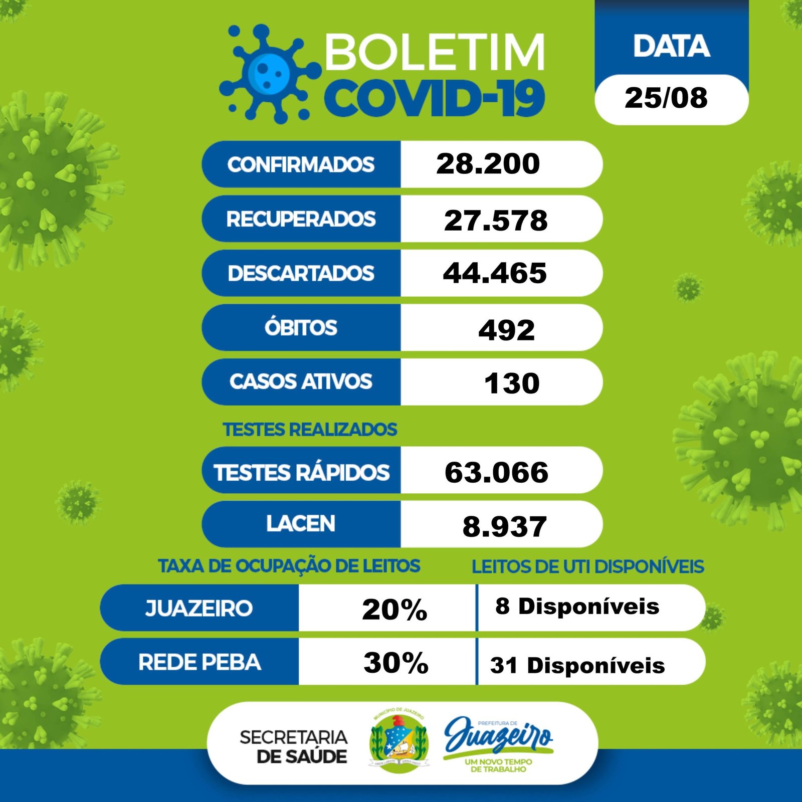 De acordo com o levantamento, 28.200 moradores foram infectados desde o início da pandemia na cidade, dos quais 27.578 já estão recuperados. Os casos descartados somam 44.465. Juazeiro tem 130 casos ativos do novo coronavírus.