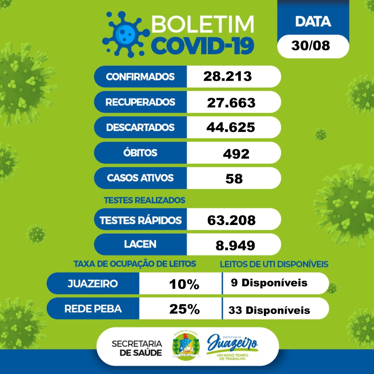 De acordo com o levantamento, 28.213 moradores foram infectados desde o início da pandemia na cidade, dos quais 27.663 já estão recuperados. Os casos descartados somam 44.625. Juazeiro tem 58 casos ativos do novo coronavírus.