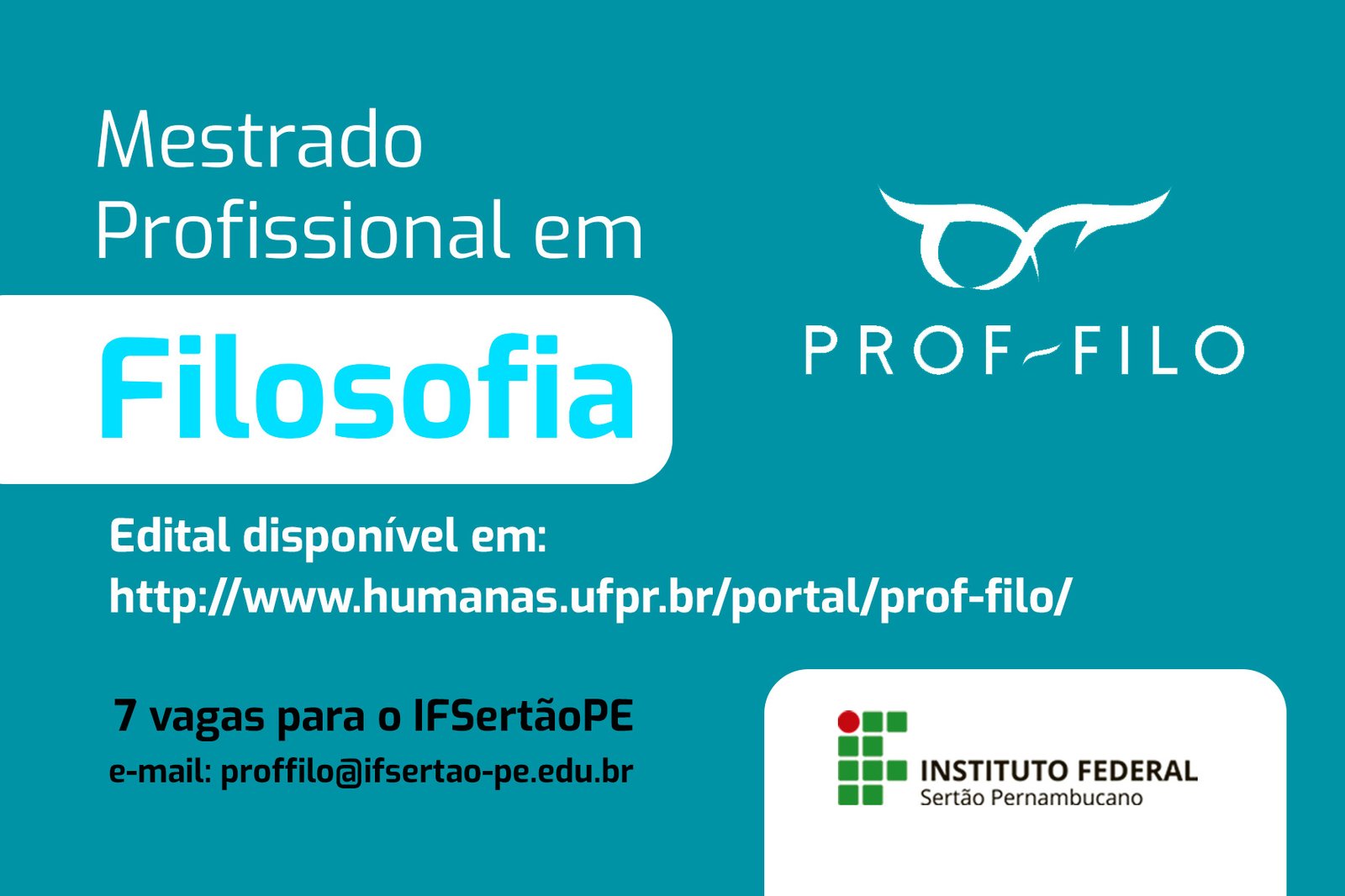 Os interessados em participar do processo seletivo para o primeiro Mestrado em Filosofia da região têm até o dia 26 de setembro para realizarem a inscrição. O curso em rede será oferecido pelo Instituto Federal de Educação, Ciência e Tecnologia do Sertão Pernambucano (IFSertãoPE), no Campus Petrolina Zona Rural, em parceria com a Universidade Federal do Paraná (UFPR). Quem deseja concorrer a uma das sete vagas disponíveis em Petrolina deve realizar a inscrição neste link. A taxa de inscrição custa R$ 60,00.