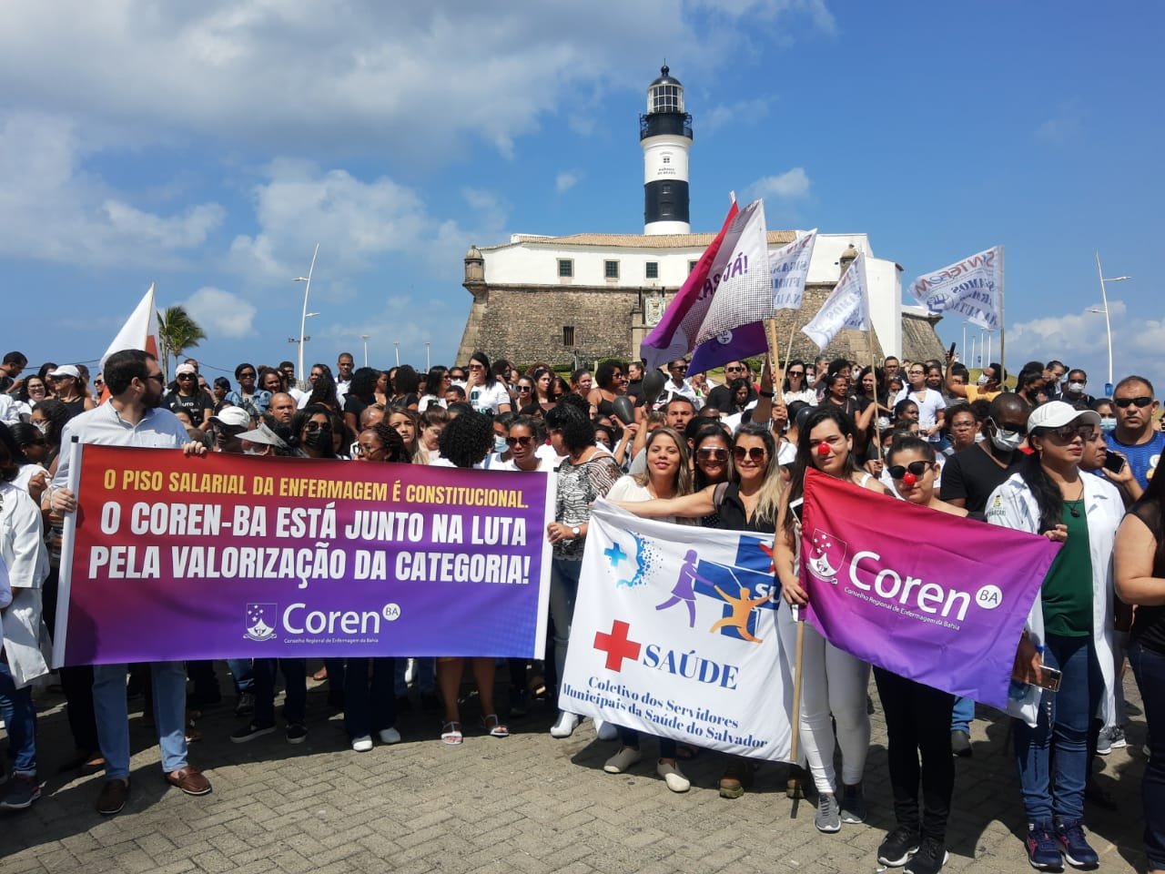 Uma multidão formada por profissionais de enfermagem realizou uma manifestação que tomou as ruas da Barra, em Salvador, nesta quarta-feira (21). O ato contou com o apoio do Conselho Regional de Enfermagem da Bahia (Coren-BA) e atendeu a uma deliberação do Fórum Nacional da Enfermagem de um dia de paralisação, com o objetivo de defender a implementação da lei 14.434/22 e pressionar o Congresso Nacional e o Governo Federal para que garantam as fontes de custeio do piso salarial da enfermagem.