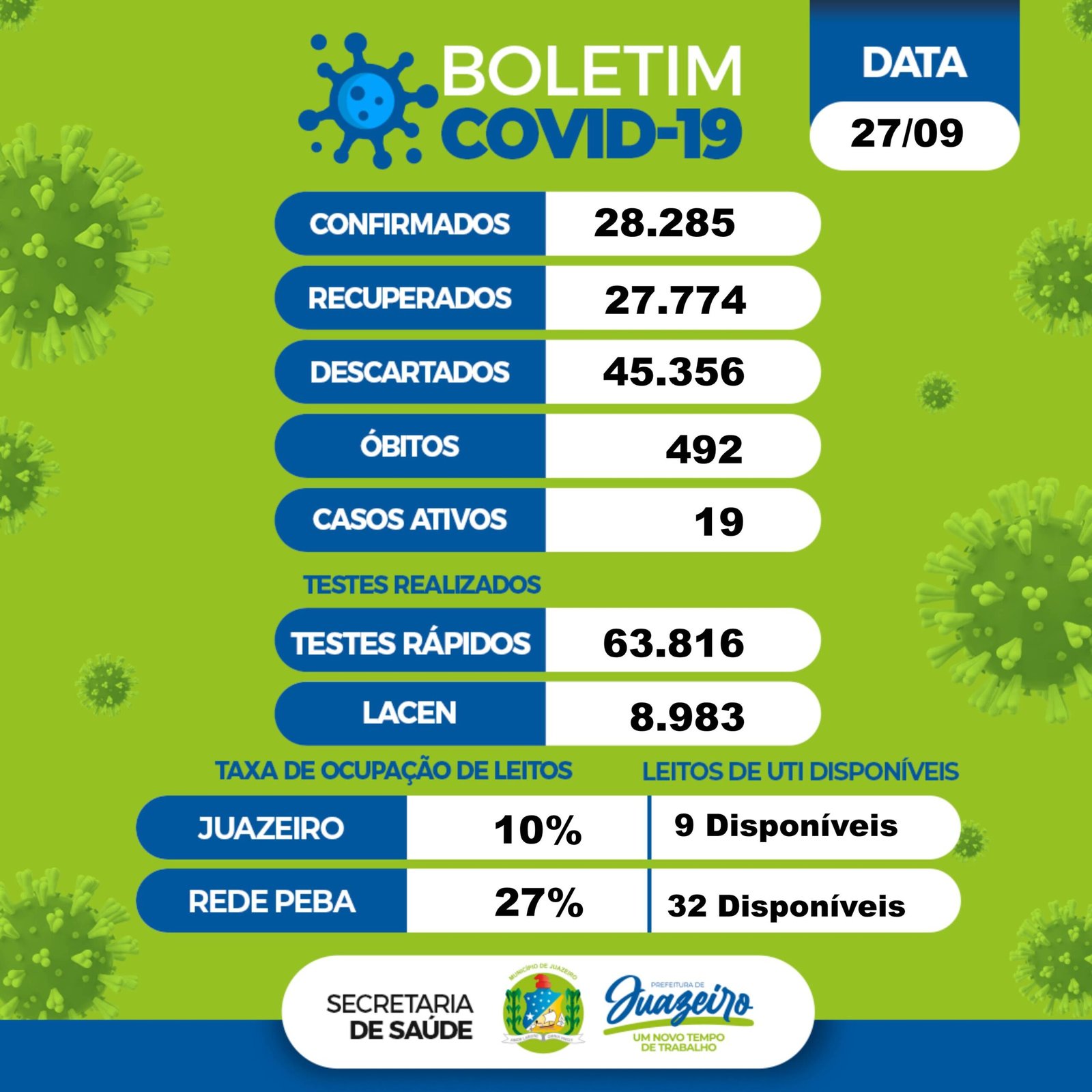 Juazeiro registrou um novo caso da Covid-19. A informação está no boletim epidemiológico da Secretaria Municipal de Saúde (Sesau) desta terça-feira (27). O município não registrou óbito por complicações da doença e permanece com 492 mortes por Covid-19.