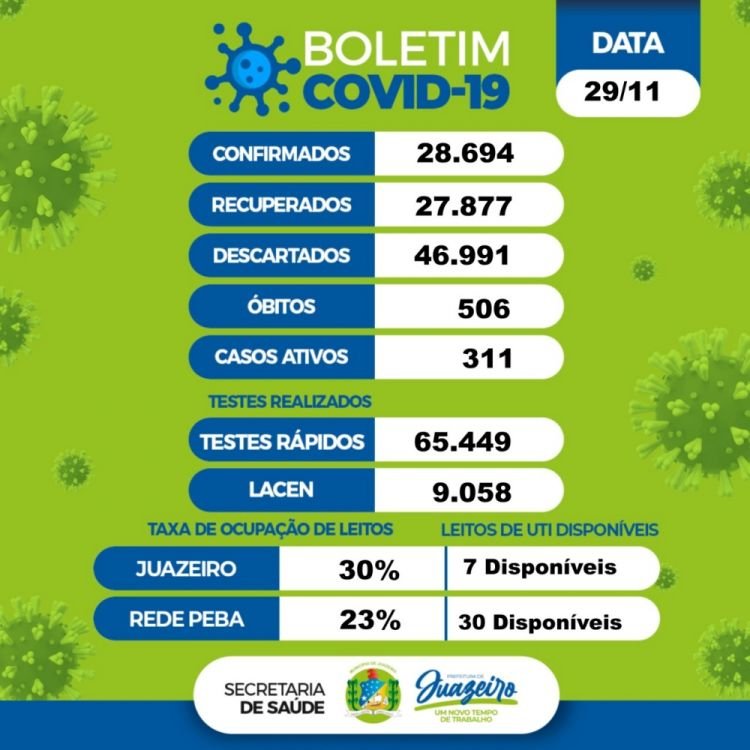 De acordo com o levantamento, 28.694 moradores foram infectados desde o início da pandemia na cidade, dos quais 27.877 já estão recuperados. Os casos descartados somam 46.991. Juazeiro tem 311 casos ativos do novo coronavírus.