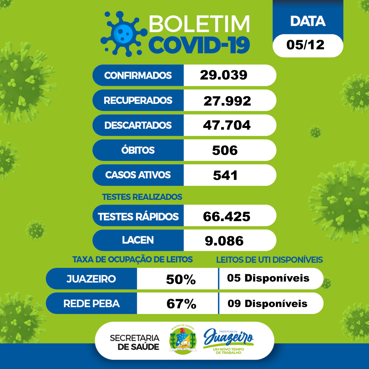 De acordo com o levantamento, 29.039 moradores foram infectados desde o início da pandemia na cidade, dos quais 27.992 já estão recuperados. Os casos descartados somam 47.704. Juazeiro tem 541 casos ativos do novo coronavírus.