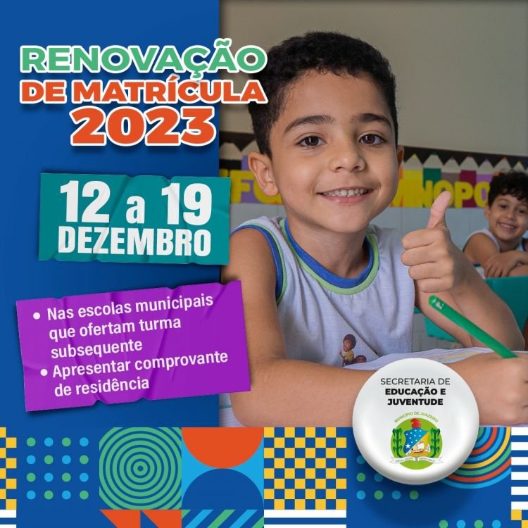 A renovação das matrículas para o ano letivo 2023, voltadas para alunos veteranos na rede municipal de ensino de Juazeiro, iniciam na próxima segunda-feira (12) e seguem até o dia 19 de dezembro.