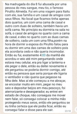 “Na madrugada do dia 8 de janeiro fui abusada por uma pessoa do meu sangue, meu tio, o famoso Pirulito Almeida. Era exatamente às 4h da manhã quando ele deitou em minha cama e começou a me abraçar, se encostar muito em mim, beijar meu pescoço e tocar em meus seios. Foi aterrorizante e desesperador, eu entrei em estado de choque, não conseguia me mover nem falar, só consegui colocar a mão para proteger minhas partes íntimas”, relatou a jovem em um vídeo e conversas de WhatsApp, que o site teve acesso.