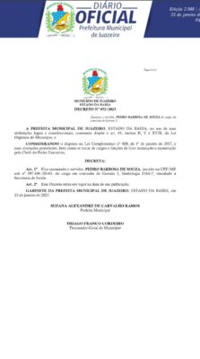 A Prefeita de Juazeiro, Suzana Ramos, em publicação no Diário Oficial desta segunda-feira (23), exonerou Pedro Barbosa de Souza, que exercia o cargo de gerente na Secretaria de Saúde.