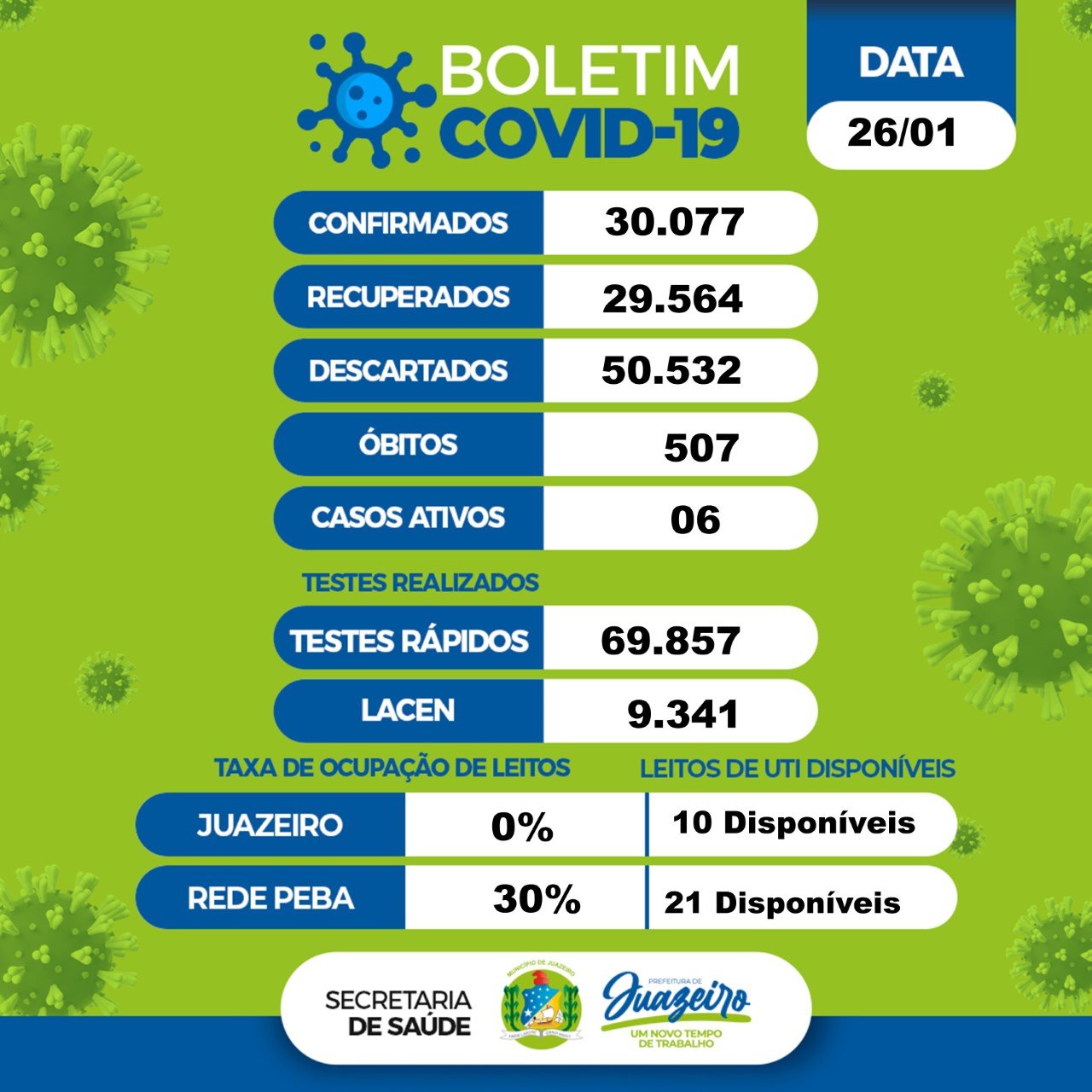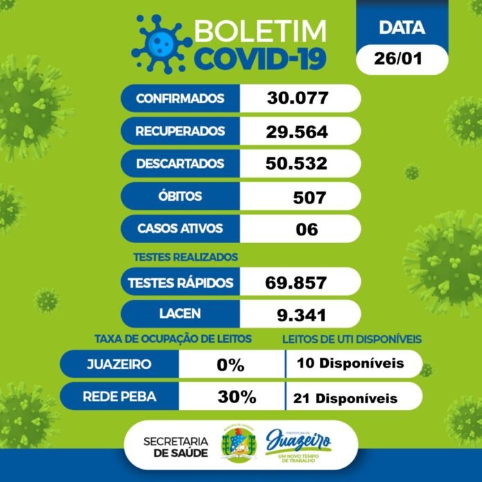 De acordo com o levantamento, 30.077 moradores foram infectados desde o início da pandemia na cidade, dos quais 29.564 já estão recuperados. Os casos descartados somam 50.532. Juazeiro tem 06 casos ativos do novo coronavírus.