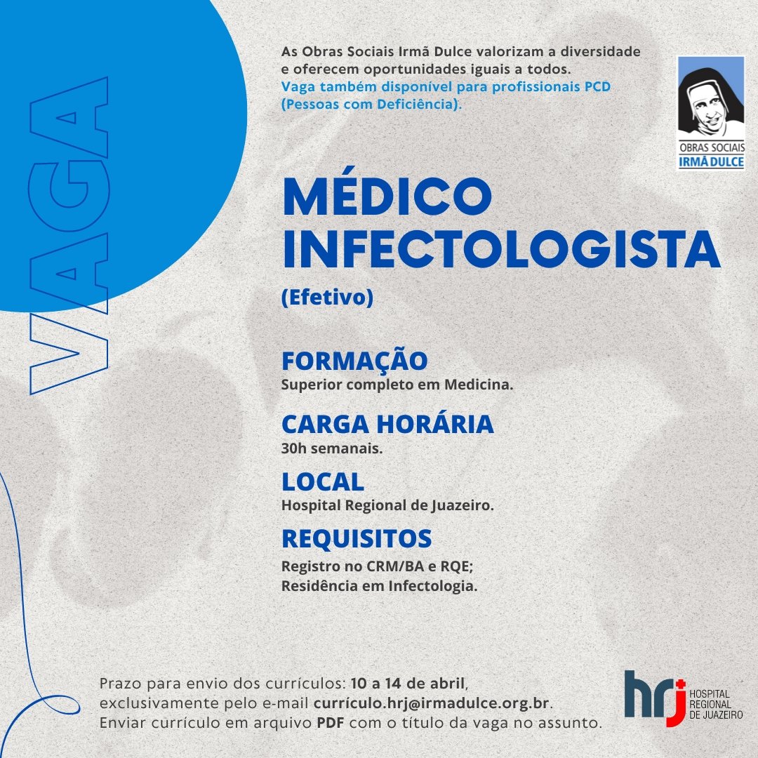O Hospital Regional de Juazeiro está com novo processo seletivo aberto para o cargo de médico infectologista. Os interessados devem enviar o currículo anexado em formato PDF através do endereço curriculo.hrj@irmadulce.org.br até o dia 14 de abril (sexta-feira). No assunto do e-mail, deve ser informado o nome da vaga a ser inscrita.