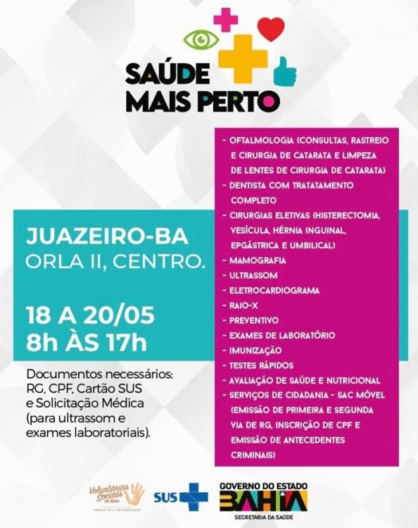 O Governo da Bahia vai realizar a partir dessa quinta-feira (18) o Programa Saúde Mais perto de Você, na orla 2 do município de Juazeiro, no Norte da Bahia. Durante a ação serão realizadas consultas, exames e outros serviços de saúde gratuitos.