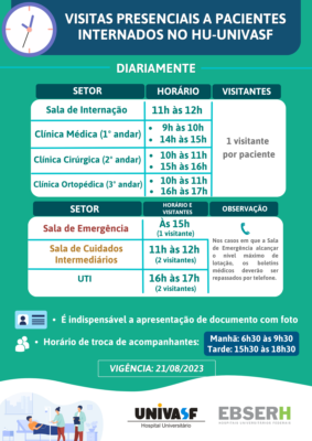 O Hospital Universitário da Univasf (HU-Univasf/Ebserh) ampliou os horários de visitas a pacientes internados na instituição, bem como atualizou a quantidade de visitantes em determinados setores, com vigência a partir da próxima segunda-feira, 21 de agosto. Todos aqueles que forem visitar ou acompanhar pacientes devem apresentar documento oficial com foto na recepção de visitas do HU. Os novos horários estão no cartaz a seguir: