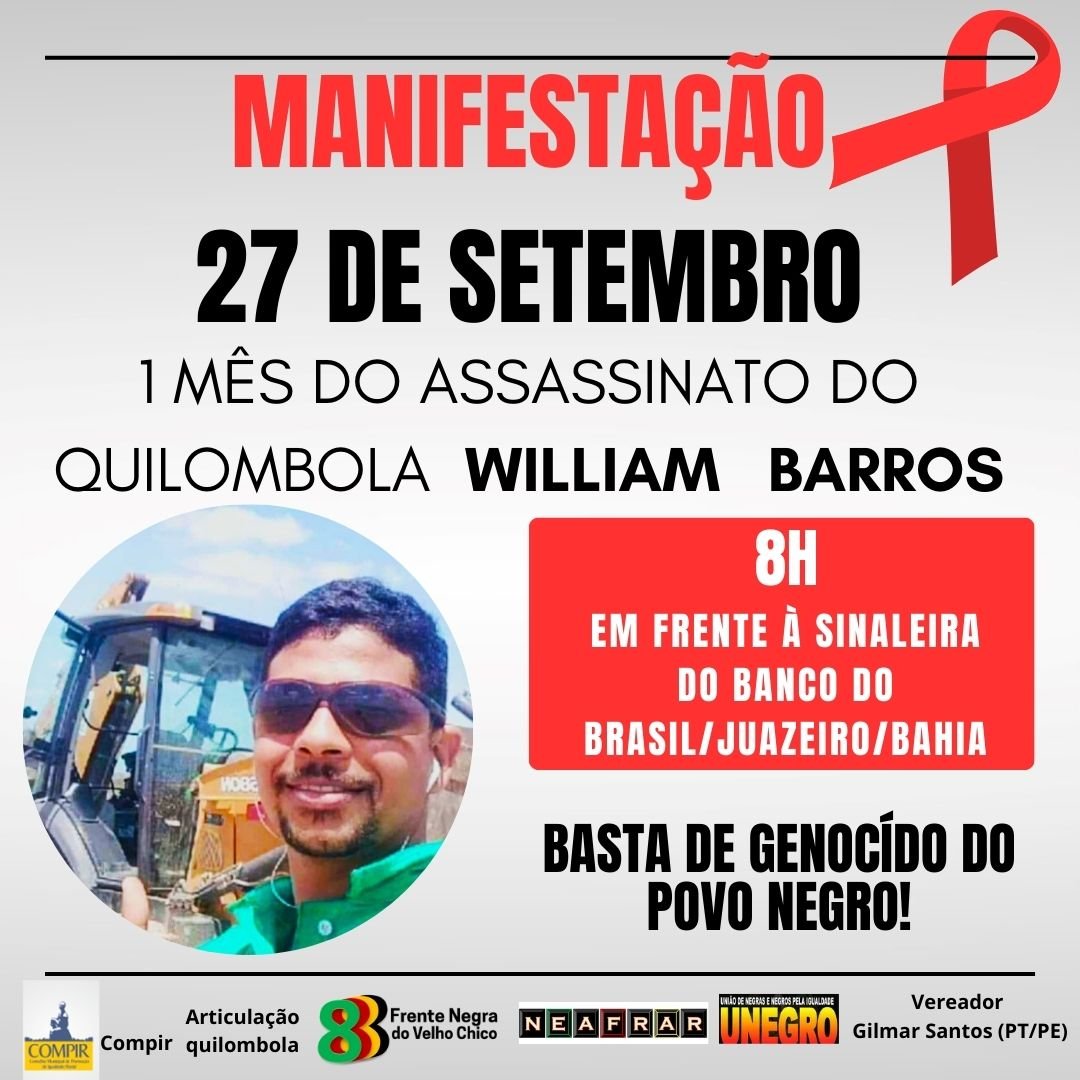 “Convidamos você a juntar-se a nós em busca de Justiça no dia em que completa um mês do assassinato do quilombola José William dos Santos Barros, alvejado com três tiros nas costas, pela Polícia Militar. A tragédia devastou a família, os amigos, toda a Comunidade Quilombola do Alagadiço (Juazeiro/Bahia) e todas as vilas do Salitre, sujeitas à arbitrariedade de agentes do Estado, que deveriam estar a nosso serviço e não oprimindo e assassinando inocentes. É mais um quilombola que tomba pelas mãos do Estado. A Bahia é o estado com maior número de assassinatos cometido pela Polícia Militar. Reforce esse movimento!! Celebremos a vida de William, resgatando sua memória e cuidando do futuro das nossas comunidades negras,” convidaram os organizadores.