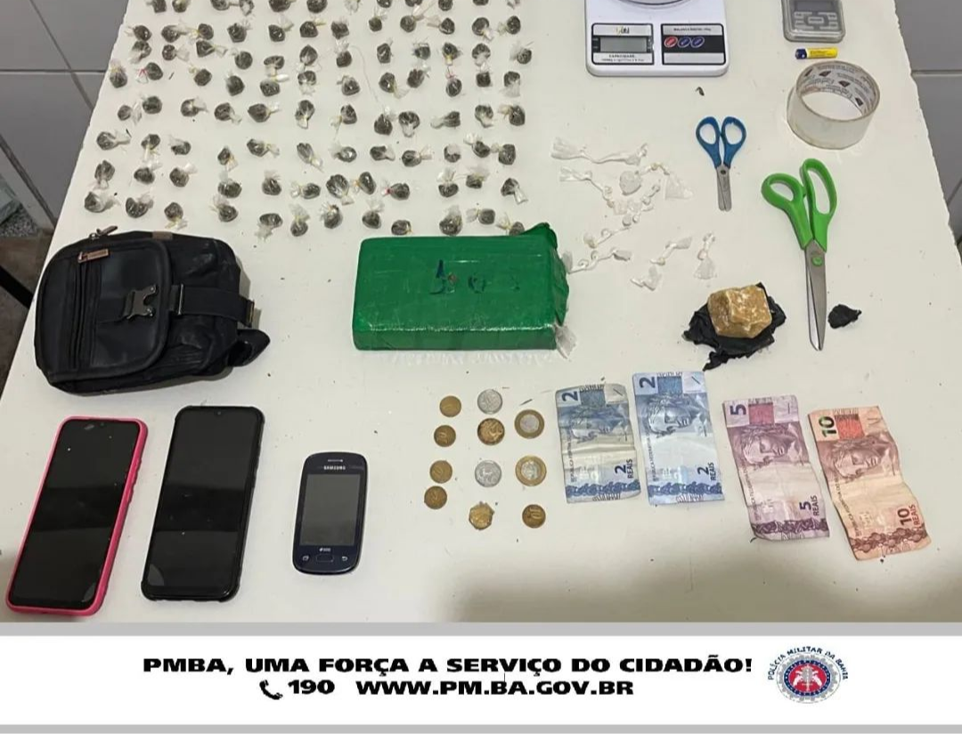 A 74ªCIPM informou ainda que apreendeu com os suspeitos os seguintes materiais: 120 (cento e vinte) trouxas de substância análoga à cannabis sativa (maconha) e 01 (uma) barra da mesma substância, 21 (vinte e uma) pedras de substância análoga ao crack e 01 (uma) pedra menor da mesma substância, pesando cerca de 60g; 02 (duas) balanças de precisão, 02 (duas) tesouras, 01 (uma) fita para embalagem de material, 03 (três) aparelhos celulares e a quantia de R$22,60 (vinte e dois reais e sessenta centavos) em espécie. Os suspeitos e todo o material apreendido foram apresentados à Delegacia de Polícia para as providências legais.