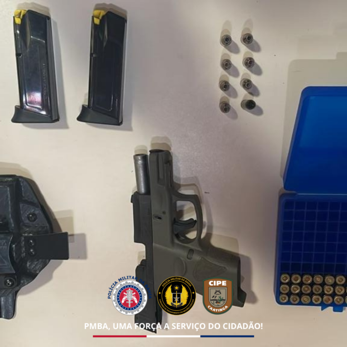 “Durante as buscas no veículo, foi localizada 01 (uma) pistola Taurus G2C, calibre 9mm, número série ACJ310254, 38 (trinta e oito) munições intactas de igual calibre, e 02 (dois) carregadores 9mm,” informou a PM.