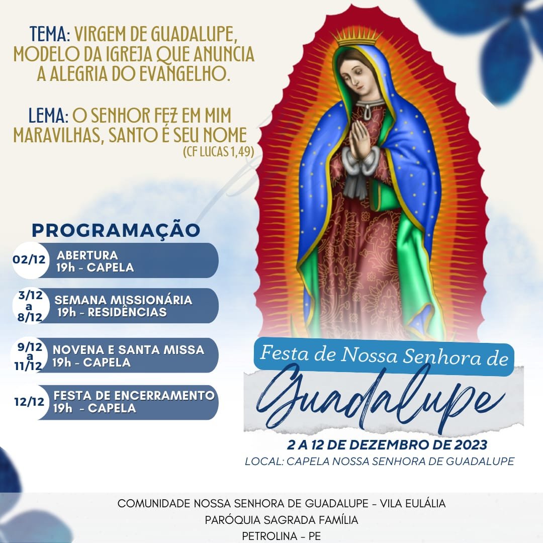 A comunidade católica da Paróquia Sagrada Família, no Bairro Vila Eulália, zona norte de Petrolina – PE, está promovendo no período de 2 a 12 de dezembro, a Festa de Nossa Senhora de Guadalupe, com o tema “Virgem de Guadalupe modelo da igreja que anuncia a alegria do evangelho”.