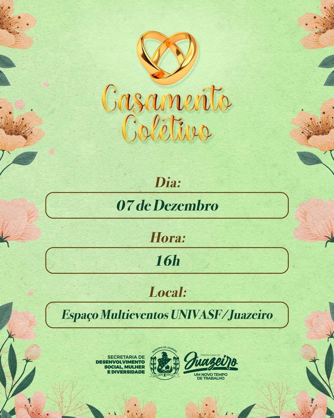 Tudo pronto para a 2ª edição do Casamento Coletivo de Juazeiro, realizada pela Prefeitura, através da Secretaria de Desenvolvimento Social, Mulher e Diversidade (Sedes). A cerimônia será realizada hoje (7), no Auditório Multieventos da Universidade Federal do Vale do São Francisco (Univasf), às 16h.  O Casamento Coletivo já uniu mais de cem casais no município em situação de vulnerabilidade social. Nesta edição, novos noivos irão oficializar a união. “O Casamento Coletivo trabalha inclusão social e o fortalecimento dos vínculos familiares ao realizar a união oficial de casais. O Casamento Coletivo é a realização de sonho, daqueles que desejam formalizar o casamento, mas não possuem condições de custear a cerimônia”, destacou a superintendente de Políticas Sociais, Janileide Pereira.Ascom