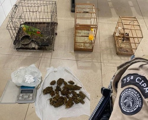 Segundo a PM, o homem foi flagrado com maconha, cocaína, além de uma balança de precisão. Com ele, a PM informou que encontrou também pássaros silvestres presos em gaiolas, o que se configura como crime contra a fauna (Lei nº 9.605/98, artigo 29).