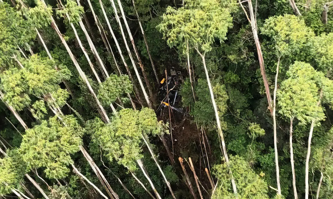 O helicóptero foi localizado em região de mata fechada, de difícil acesso, e o primeiro acesso dos policiais militares foi feito por rapel, a partir do helicóptero da corporação.