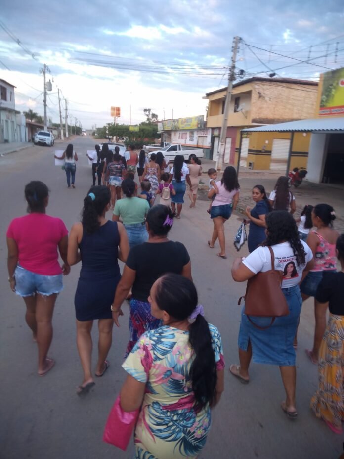 “Eu quero pedir justiça. Pena máxima para esse agressor”, palavras da mãe da jovem Maria de Lourdes Mirelly dos Santos Nascimento, durante Caminhada Contra o Feminicídio, realizada no distrito de Maniçoba, Juazeiro, neste sábado (20).