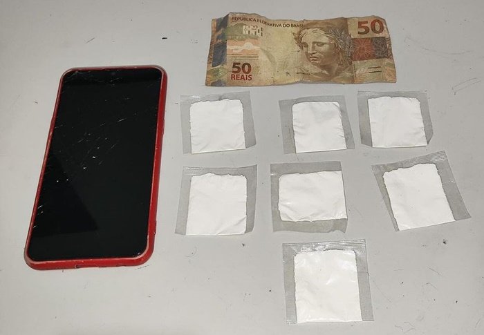 Foram apreendidos: 7 (sete) invólucros de substância análoga à cocaína; R$: 50,00 (cinquenta reais) em espécie; 1 (um) aparelho celular.