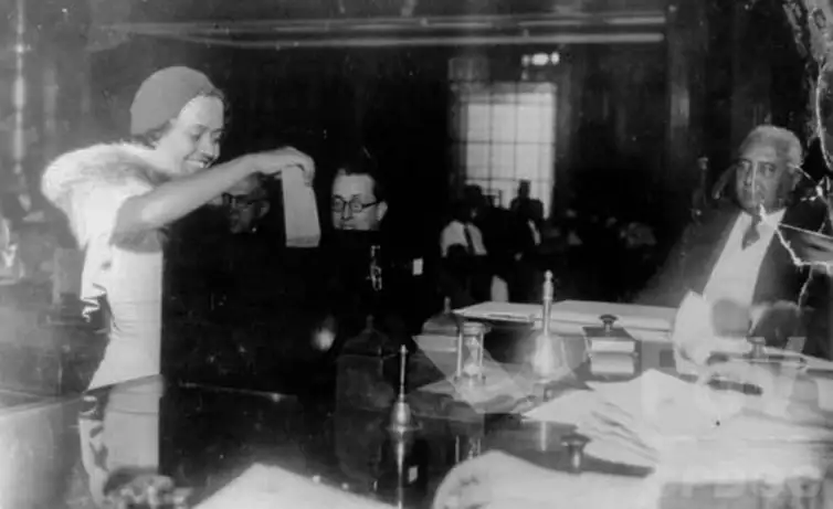 Homens observam uma mulher diante da urna. Ela, vestida como para uma festa, com a cédula na mão e o sorriso no rosto, está pronta para exercer um direito básico de cidadania. A caminhada da alagoana Almerinda Farias Gama até o voto (para eleição de deputados classistas), em 20 de julho de 1933, é feita de luta com os barulhos da voz e da máquina de escrever. Neste sábado (24), quando se completam 92 anos da garantia do voto feminino, os passos que foram invisibilizados dessa sufragista negra, feminista e nordestina refletem a necessidade de reconhecimento e revisão histórica como inspiração para o país.