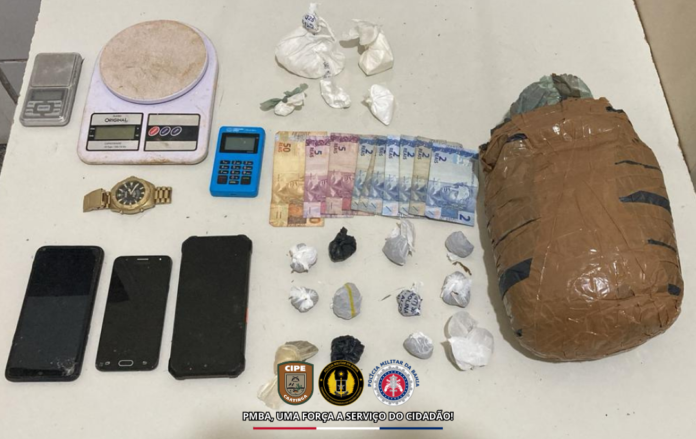 A Polícia Militar da Bahia, através da Companhia Independente de Policiamento Especializado (CIPE-Caatinga), apreendeu nesta quinta-feira (29), drogas no povoado do Salitre, em Juazeiro BA.“Os policiais militares especializados realizavam patrulhamento e abordagens na localidade, quando observaram um homem que ao avistar a viatura policial, empreendeu fuga no matagal e abandonou uma mochila contendo 03 (três) celulares, 02 (duas) balanças de precisão, 01 (um) relógio, 01 (uma) maquineta de cartão, R$ 74,00 (setenta e quatro) reais em espécie, aproximadamente 1 kg de substância análoga a maconha e 160 g de substância branca análoga a cocaína,” informou a PM.O material foi apresentado à Delegacia de Polícia Civil de Juazeiro – BA, para adoção das medidas legais cabíveis.Redação PNB, com informações Ascom/ CIPE-Caatinga