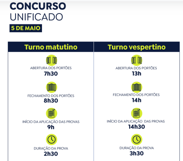 A prova terá início às 9h, com duração de duas horas e trina minutos. Já no turno vespertino, os portões abrirão às 13h e fecharão às 14h. O início da aplicação das provas será às 14h30 e o tempo de duração será de três horas e trinta minutos.