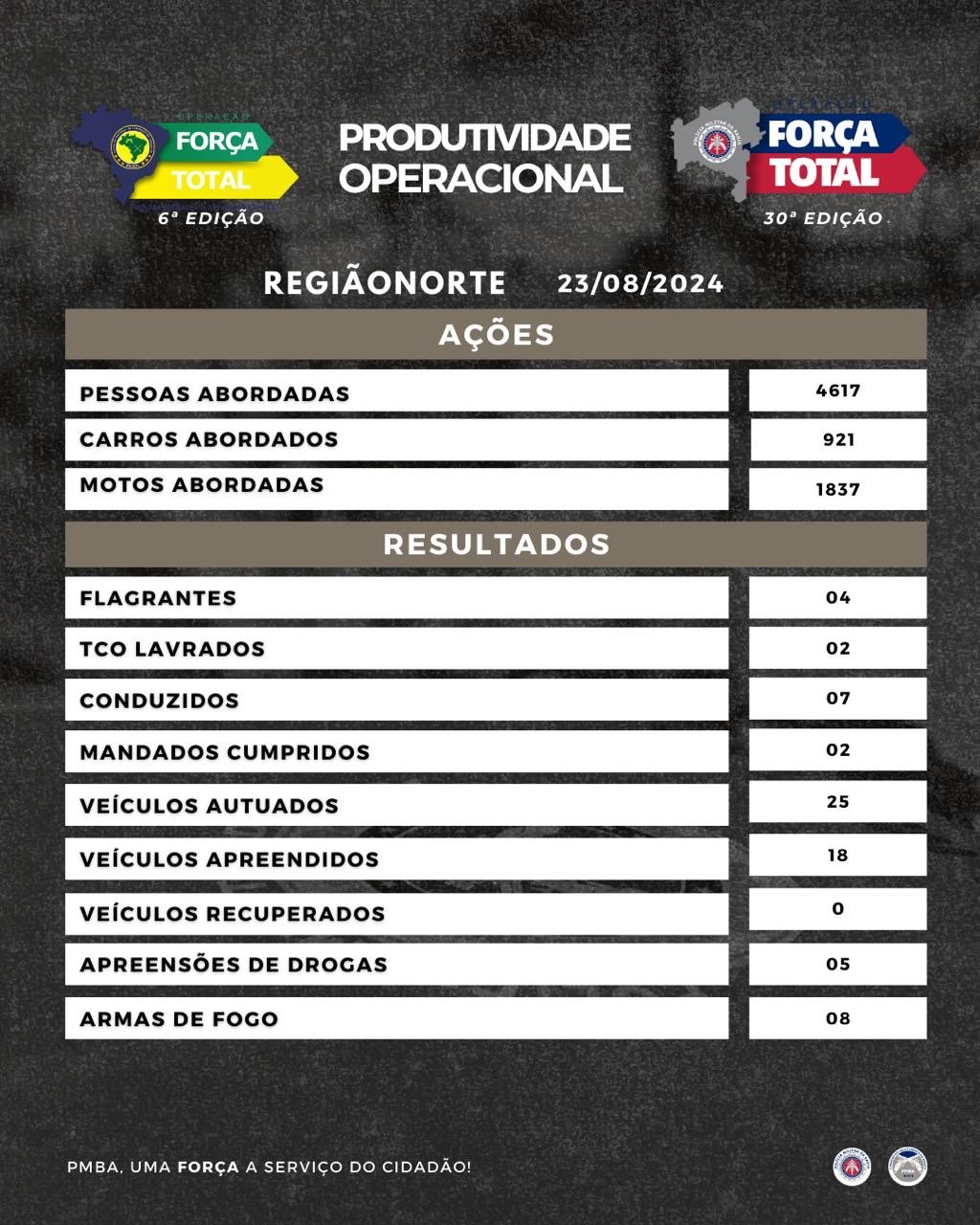 A OPERAÇÃO FORÇA TOTAL, em sua 30ª Edição ocorreu com grande sucesso, alcançado excelentes resultados na sua produtividade, reforçando o compromisso de todos os Policiais Militares de servir e proteger à sociedade com excelência e aqueles que nos visitam.