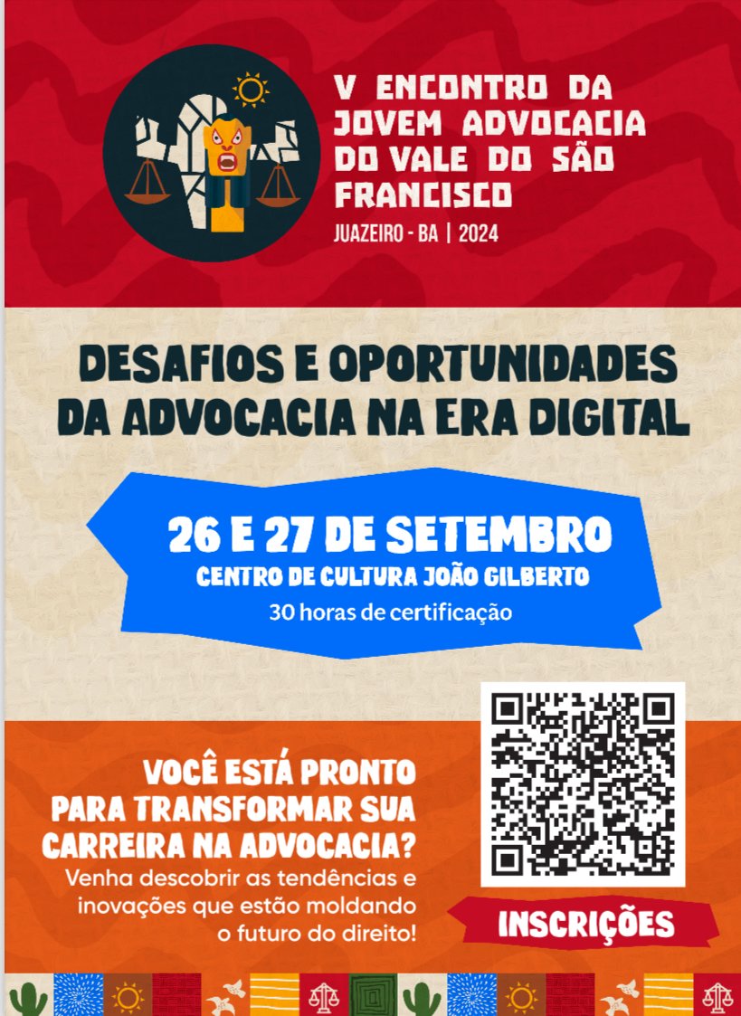 Nos dias 26 e 27 de setembro de 2024, Juazeiro (BA) será palco do V Encontro da Jovem Advocacia do Vale do São Francisco, com o tema “Desafios e Oportunidades da Advocacia na Era Digital”. O evento ocorrerá no Centro de Cultura João Gilberto e oferecerá 30 horas de certificação para os participantes.