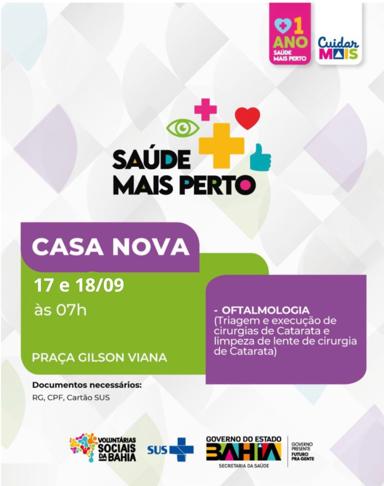 Nos dias 17 e 18 de setembro, no município de Casa Nova, Norte da Bahia, ocorrerá a Feira Saúde Mais Perto, com oferta de cuidados oftalmológicos, serviços de triagem, cirurgias de catarata e limpeza de lentes para quem já passou por esses procedimentos. A ação do Governo do Estado da Bahia vai acontecer na Praça Gilson Viana, a partir das 7 horas.