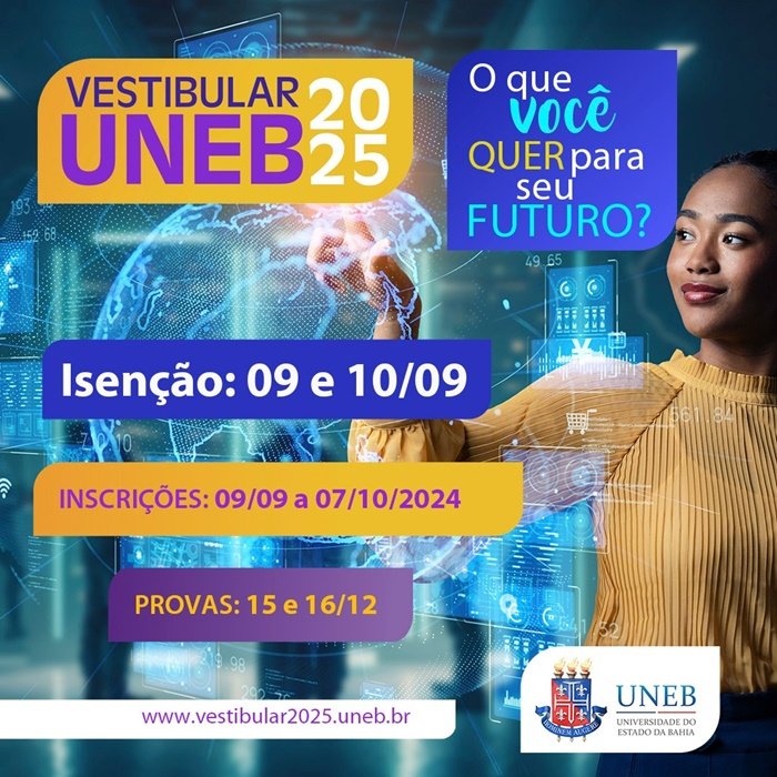 A Universidade do Estado da Bahia (UNEB) mantém as inscrições abertas para o vestibular UNEB 2025 até o dia 7 de outubro, pelo site vestibular2025.uneb.br.