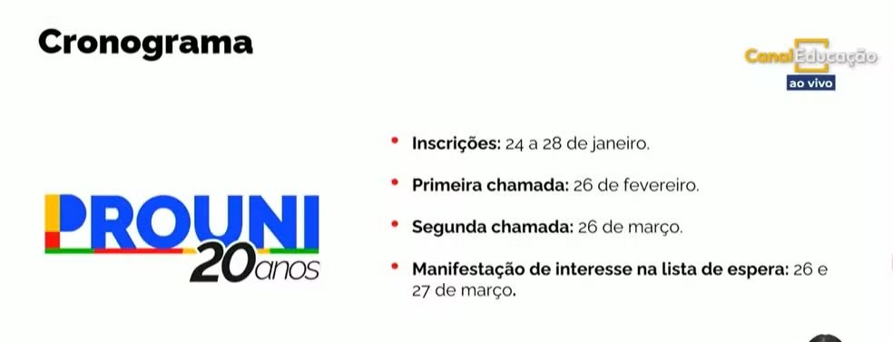 O ministro da Educação, Camilo Santana, divulgou nesta segunda-feira (13) o possível calendário para o Prouni e para o Fies do 1º semestre de 2025. As datas ainda não são oficiais, já que não há editais publicados para os programas.