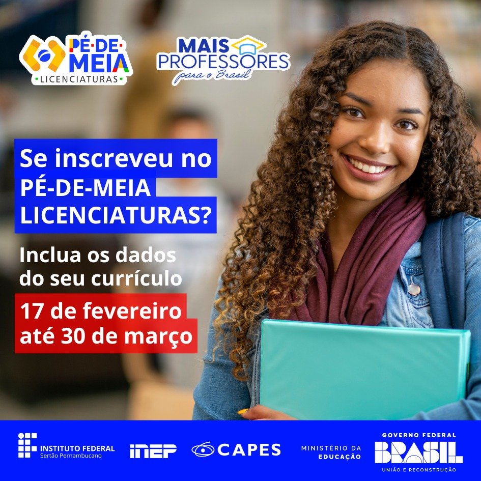 Até o dia 30 de março de 2025, os estudantes aprovados para os cursos presenciais de licenciatura do Instituto Federal do Sertão Pernambucano (IFSertãoPE) e elegíveis ao Pé-de-Meia Licenciaturas deverão cadastrar os seus dados para concorrer às bolsas do programa. De acordo com o Ministério da Educação (MEC), a etapa vale para aprovados no Sistema de Seleção Unificada (Sisu), no Programa Universidade para Todos (Prouni) e no Fundo de Financiamento Estudantil (Fies) e para quem teve nota acima de 650 no Exame Nacional do Ensino Médio (Enem) 2024.