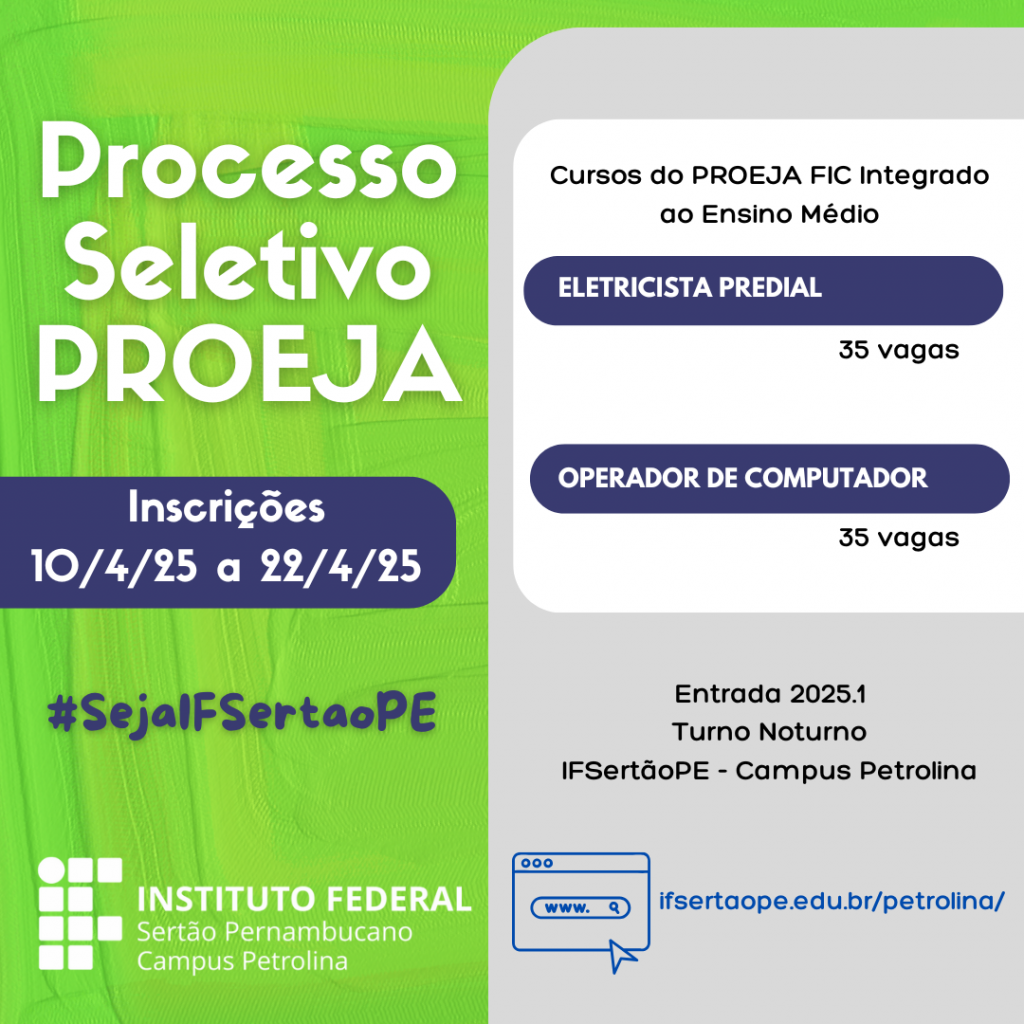 O Campus Petrolina do IFSertãoPE está com inscrições gratuitas abertas, de 10 a 22 de abril de 2025, para os cursos de Formação Inicial e Continuada (FIC) integrados ao Ensino Médio, nas áreas de Eletricista Predial e Operador de Computador. A oferta é realizada por meio do Programa Nacional de Integração da Educação Profissional com a Educação Básica na Modalidade de Educação de Jovens e Adultos (PROEJA).
