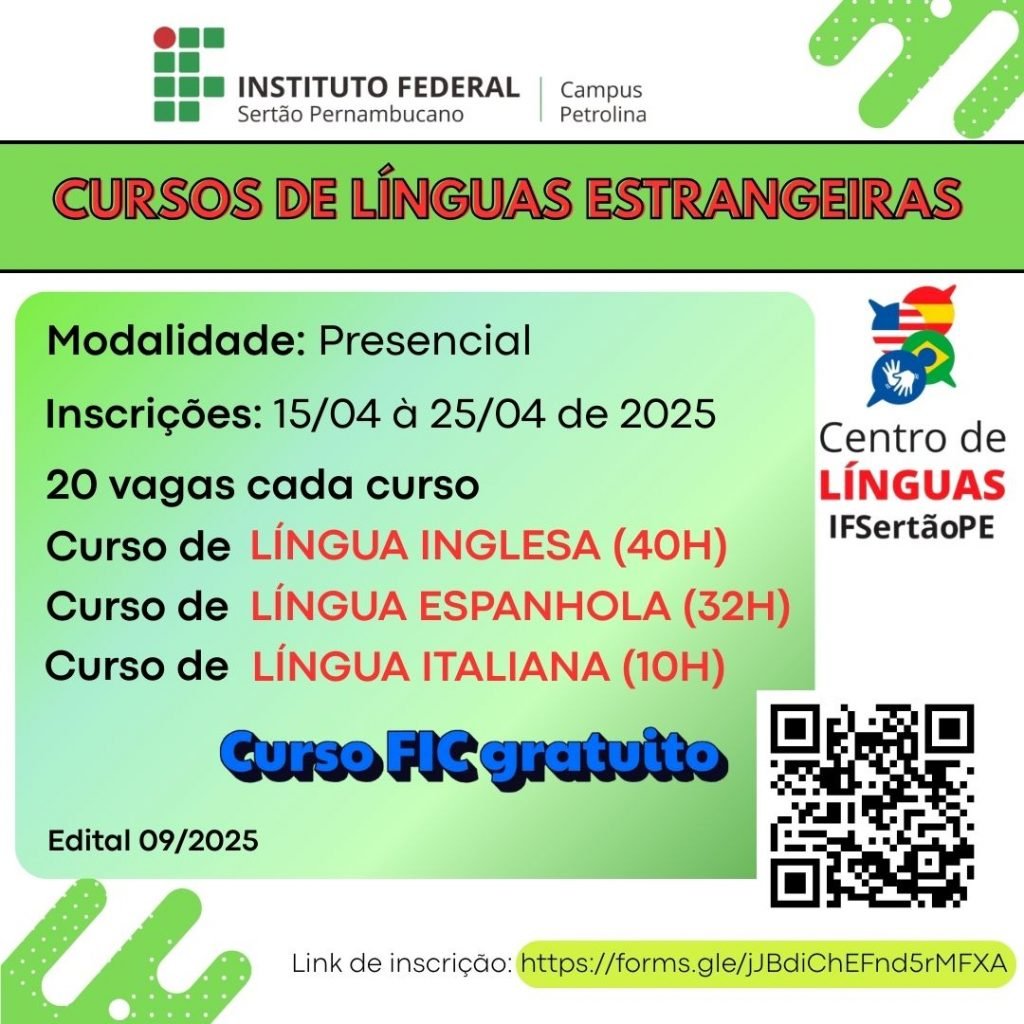 O campus Petrolina do Instituto Federal do Sertão Pernambucano (IFSertãoPE) publicou o Edital nº 9/2025, com 60 vagas gratuitas para cursos de inglês, espanhol e italiano, na modalidade Formação Inicial e Continuada (FIC). As aulas serão presenciais e as oportunidades são para os cursos de Língua Inglesa, Língua Espanhola e Língua Italiana. As inscrições e o curso são inteiramente gratuitos.