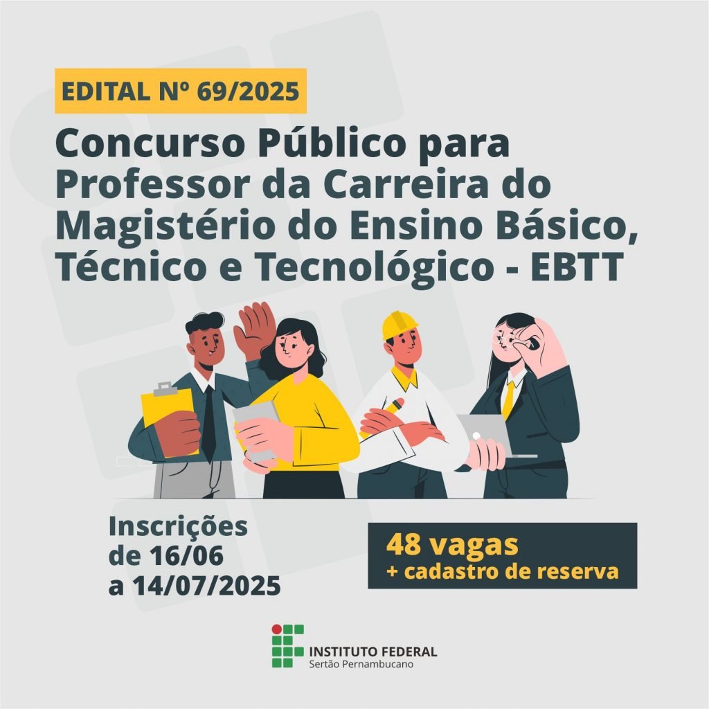 Foi publicado no Diário Oficial da União (DOU), o edital nº 69/2025, referente à abertura de concurso público para Professor da Carreira do Magistério do Ensino Básico, Técnico e Tecnológico – EBTT do Instituto Federal do Sertão Pernambucano (IFSertãoPE). Além de 48 vagas imediatas, o certame prevê a formação de cadastro de reserva para cargos de provimento efetivo.