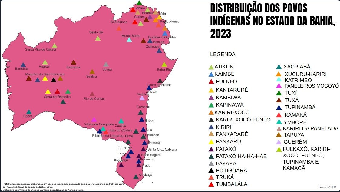 “Com a tabela disponibilizada, uni os dados à estrutura da plataforma com os limites municipais da Bahia, disponibilizado pelo IBGE. Após a seleção dos municípios onde se localizam as comunidades, utilizei a Plataforma Visme, destinada para a composição gráfica, visando evidenciar as diferentes etnias e criar a legenda e demais partes da figura”, explicou Ythana, que atualmente cursa mestrado em Geografia, na Universidade Federal de Sergipe (UFS).
