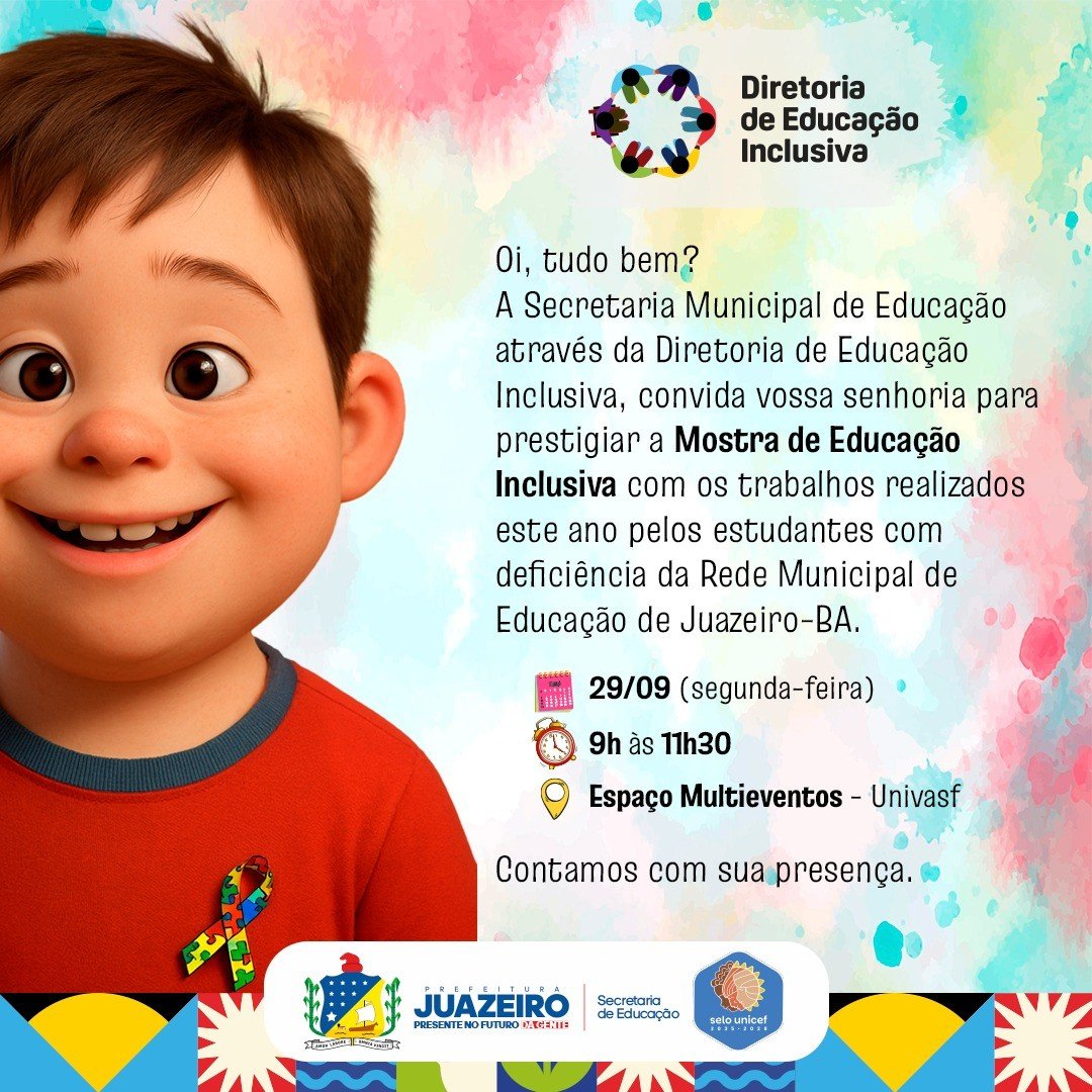 A Prefeitura de Juazeiro, por meio da Secretaria de Educação/Seduc, vai promover na próxima segunda-feira (29) a primeira Mostra de Educação Inclusiva da rede municipal. O evento, coordenado pela Diretoria de Educação Inclusiva da Seduc, será realizado das 9h às 11h30, no Espaço Multieventos da Universidade Federal do Vale do São Francisco/Univasf, em Juazeiro.