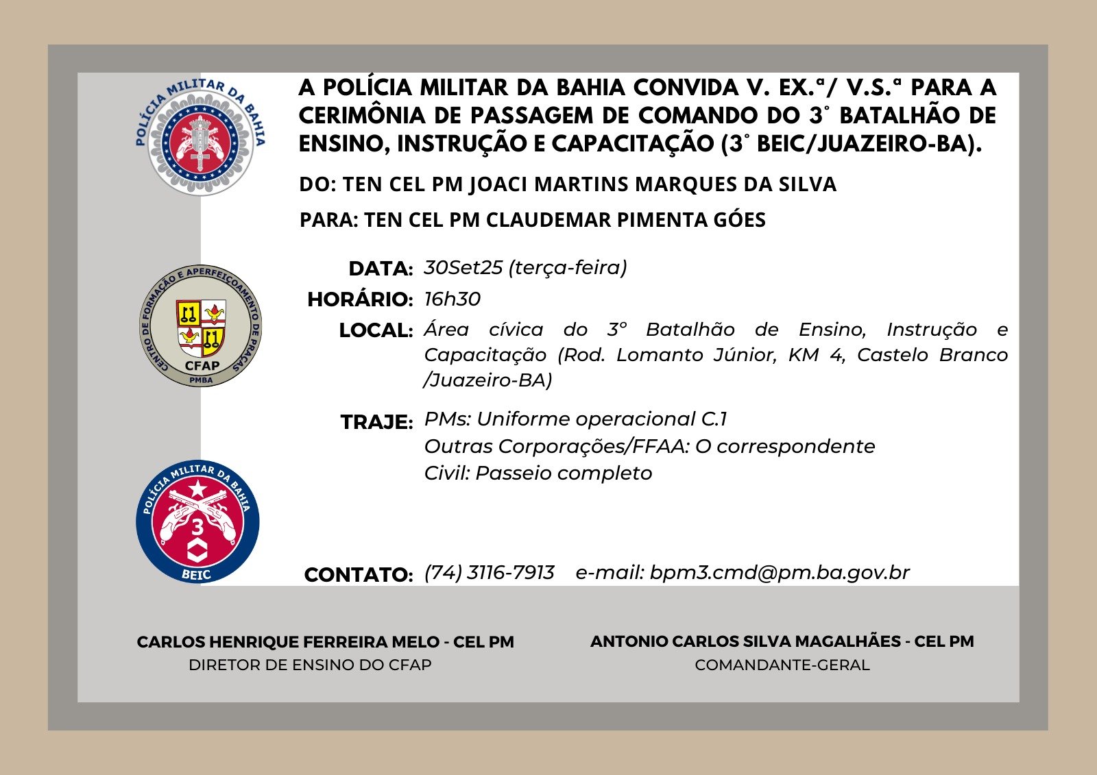 A Polícia Militar da Bahia convida para a cerimônia de passagem de comando do 3º Batalhão de Ensino, Instrução e Capacitação (3º BEIC/Juazeiro-BA). O evento marcará a transição do Ten Cel PM Joaci Martins Marques da Silva para o Ten Cel PM Claudemar Pimenta Góes.