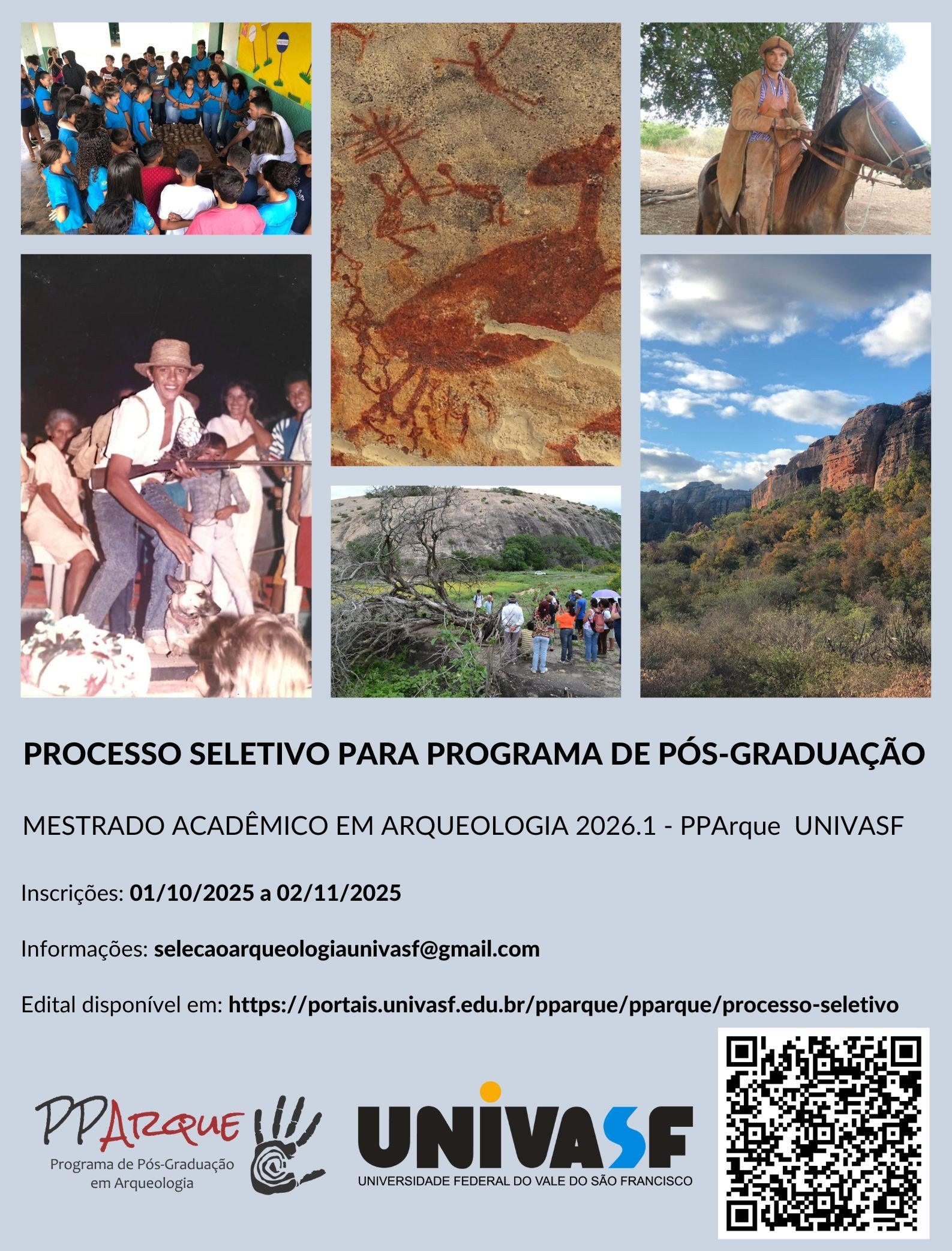 Universidade Federal do Vale do São Francisco (Univasf) lançou o processo seletivo para o Programa de Pós-Graduação em Arqueologia (PPArque), em nível de mestrado acadêmico, com ingresso previsto para o período letivo 2026.1. Ao todo, serão disponibilizadas nove vagas, distribuídas entre ampla concorrência, ações afirmativas e reserva para servidores técnicos-administrativos em educação. Podem se inscrever no processo seletivo candidatos portadores de diploma ou declaração de conclusão de curso de graduação em Arqueologia ou em áreas afins. As inscrições poderão ser feitas no período de 1º de outubro a 2 de novembro de 2025.